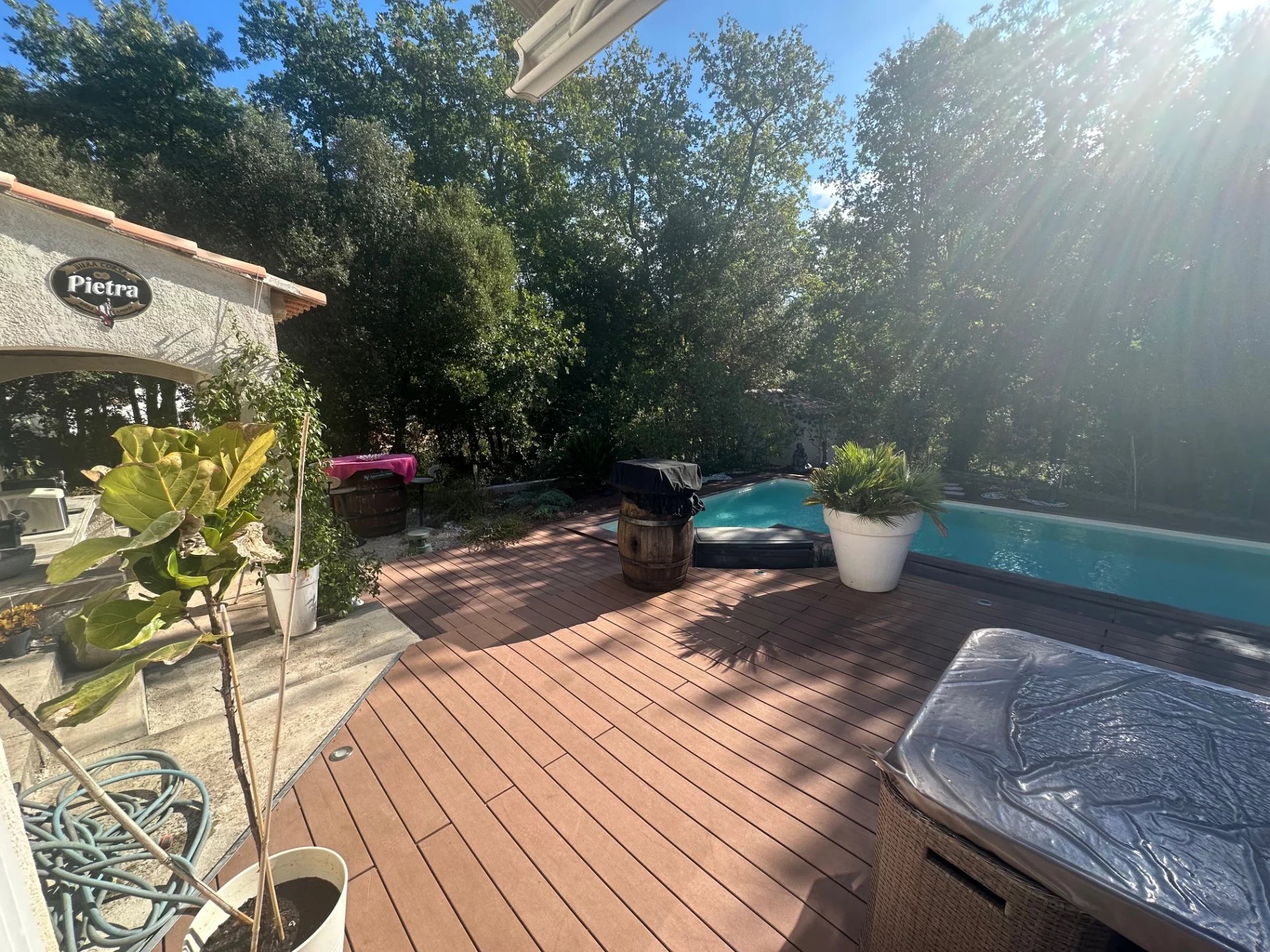 Le terrain de 1000 m2 en limite de forêt, dispose de beaucoup d'atouts : une grande terrasse avec piscine avec pompe à chaleur, une cuisine d'été, un terrain de boules et deux grands cabanons de rangements.