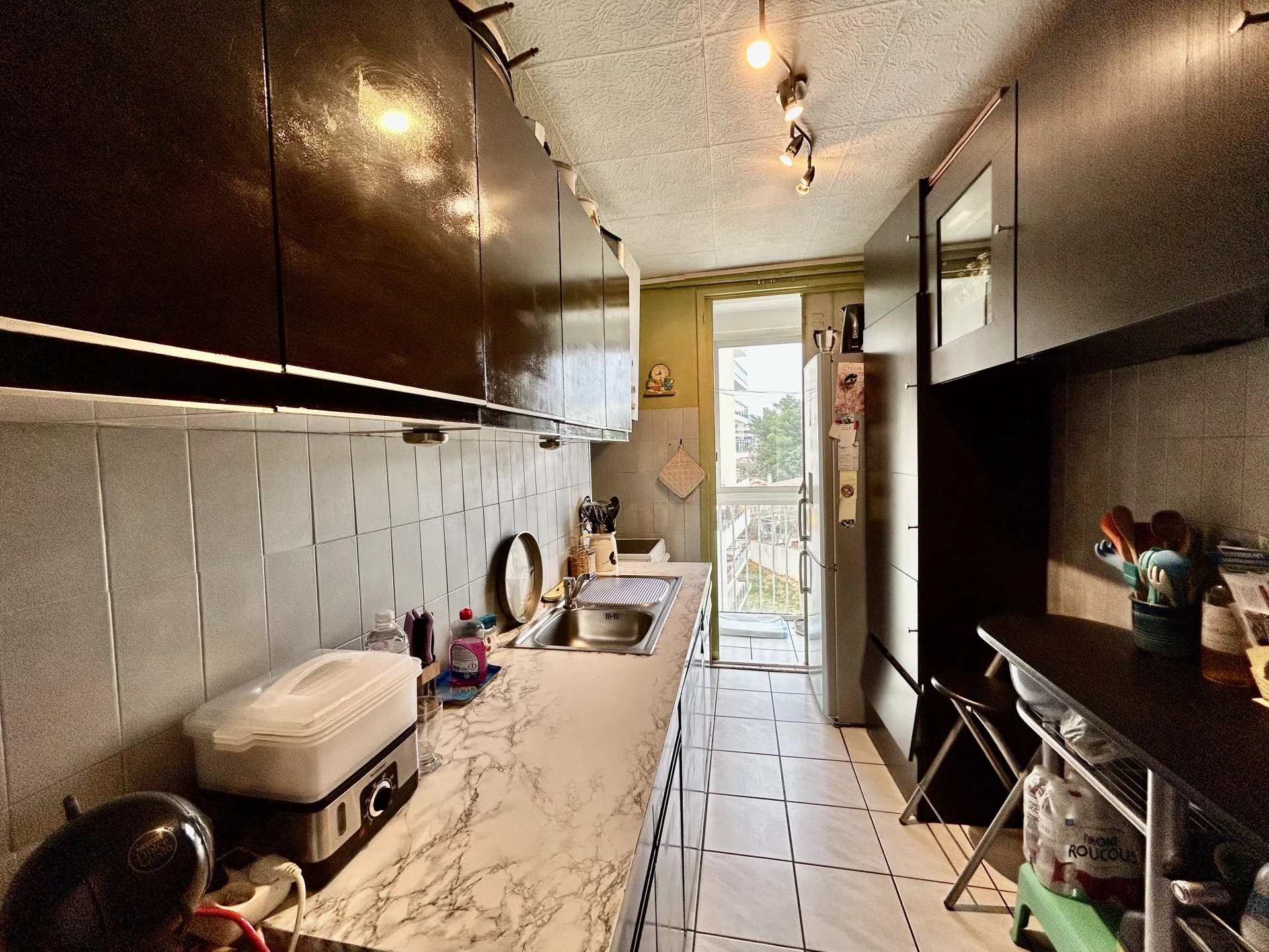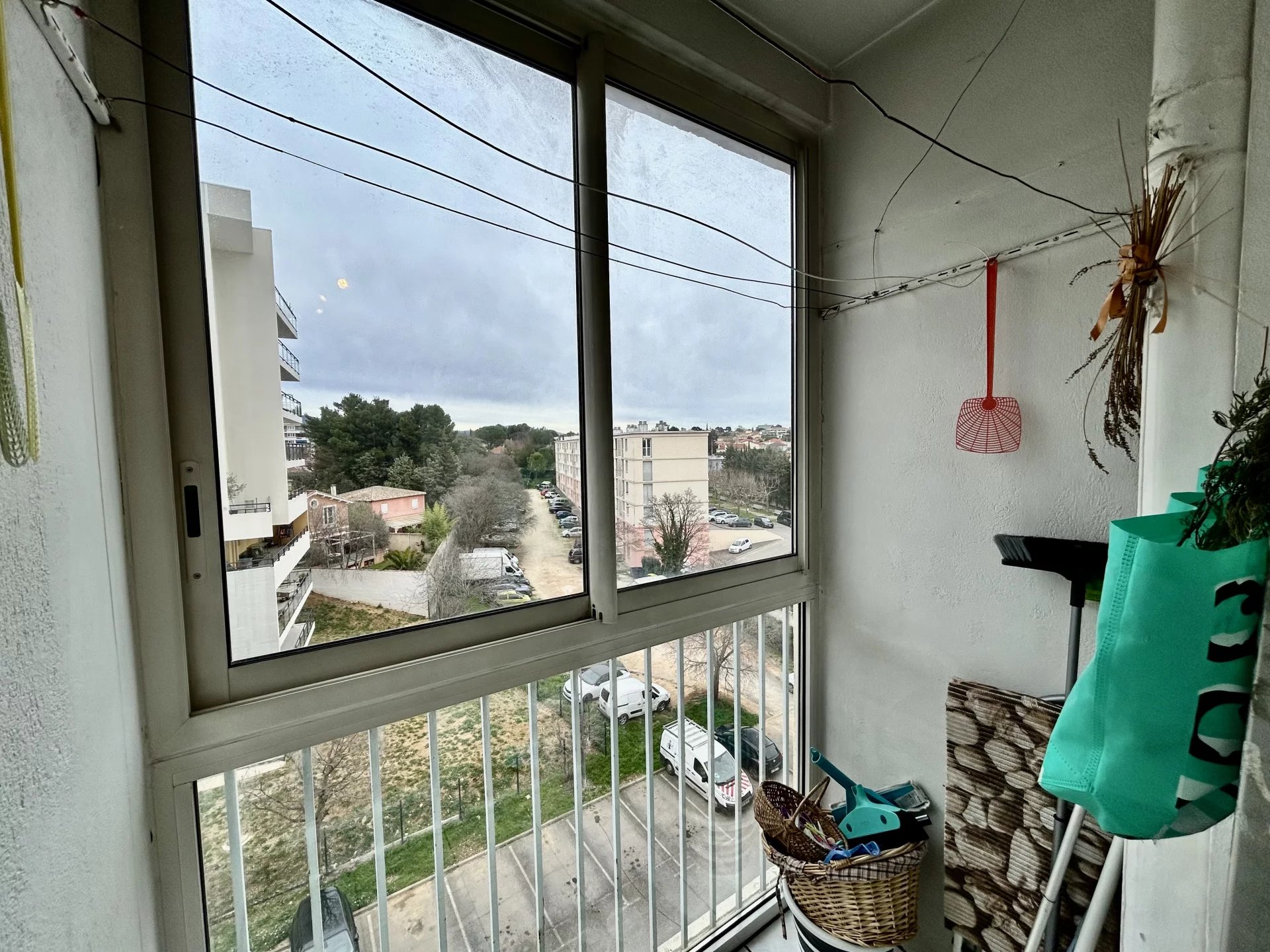 Situé au 5ème étage, traversant, il est composé d'une cuisine avec loggia, un salon donnant sur un balcon, une salle à manger (initialement 3ème chambre qui peut donc être refermée) de deux belles chambres, de toilettes indépendants, d'une salle de bains.